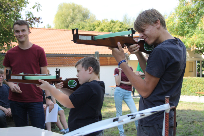 Am Samstag, den 15. September 2018 fand nun bereits zum dritten Mal der Gau Jugend Team Cup auf dem Grundstück des SV Dettingen statt. Bei perfekten Wetterbedingungen waren über 30 Jugendliche aus vielen unterschiedlichen Vereinen am Start. Wie in den vergangenen Jahren war dabei das Motto nicht in den üblichen Vereinsmannschaften anzutreten, sondern sich in bunt gemischten Teams besser kennen zu lernen. Dieses Konzept wurde von den Jugendlichen einmal mehr sehr gut angenommen. Bei Stationen wie z. B. Armbrust- und Bogenschießen, Darts und Mohrenkopfschleuder sammelten die Vierer-Teams fleißig Punkte für die Gesamtwertung. Trotz mancher Wartezeiten, da meist alle Stationen belegt waren, kam keine Langeweile auf. So sah man auch kaum einen der Jugendlichen mit dem Smartphone in der Hand. Den Abschluss und den gleichzeitigen Höhepunkt des kurzweiligen Nachmittags markierte das Abschlussspiel. Nach sechs Stationen erfolgte nämlich eine Zwischenwertung und alle Teams wussten vor dem abschließenden Quiz, wo sie im Vergleich zu den anderen standen. Doch es war noch nichts verloren. Bevor feststand, wer den GJTC 2018 gewinnt, musste jedes Team noch fünf Quizfragen beantworten. Dieses Quiz war ans Schießen gekoppelt. Eins der Teammitglieder musste nämlich vor jeder Frage einen Schuss mit dem Luftgewehr abgeben. Die erzielte Ringzahl bestimmte die Schwierigkeit der Frage, sowie die Anzahl der Punkte, die gewonnen werden konnten. Voraussetzung: Die Frage wurde vom Team richtig beantwortet. Je höher die Ringzahl, desto schwerer die Frage, aber auch umso mehr Punkte waren zu holen.
